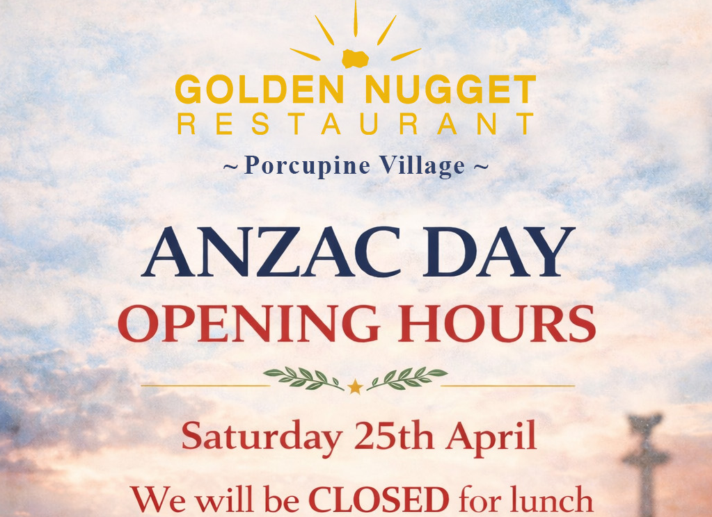 The Golden Nugget will be closed for lunch on ANZAC Day, Saturday 25th April. We will reopen for dinner with our usual menu at 6pm. Bookings recommended.