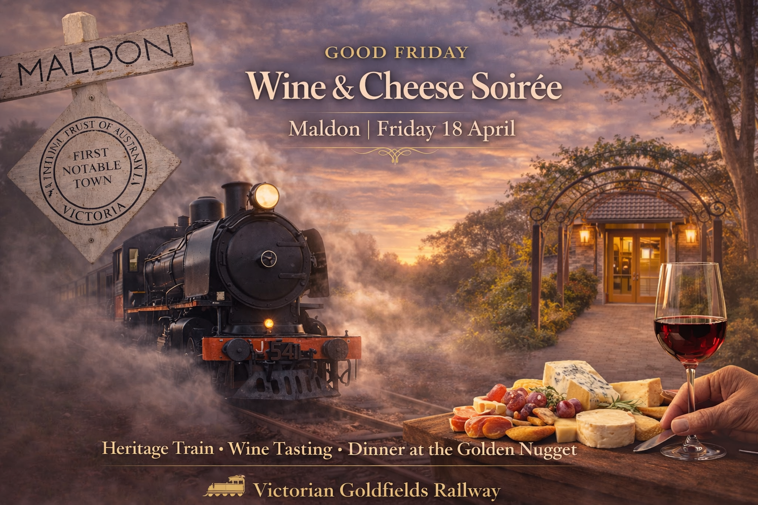This Good Friday, the beautiful heritage steam train operated by Victorian Goldfields Railway will be hosting their popular Wine & Cheese Soirée through the goldfields.